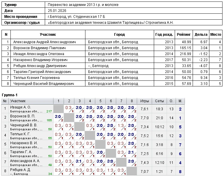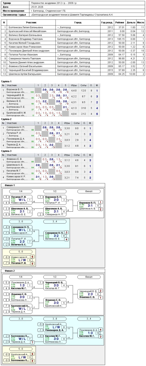 Результаты турнира 25 января 2026г Белгород (Студенческая 17б)