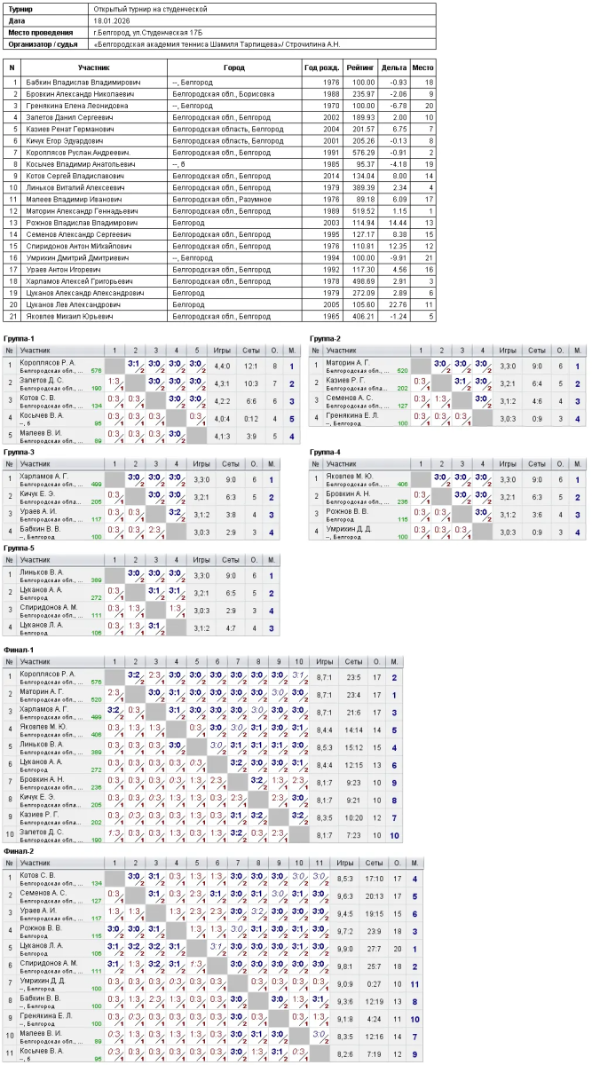 Результаты турнира 18 января 2026(на Студенческой 17б) Белгород.