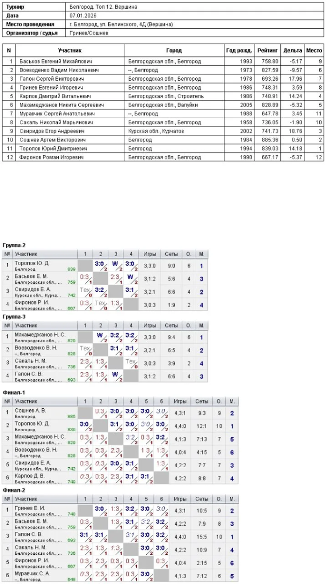Результаты топ-12, 8 января 2026г. Белгород.